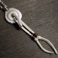 K-SMITHの細かく彫り込まれたフェザー付きのシルバーメタルトップに革ヒモとビーズを組み合わせてユニセックスなイメージに仕上がっています。