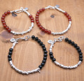 ひとつひとつ形の違うシルバービーズとカーネリアン、オニキスのビーズをRYOKUのパーツとチャームで組み合わせた